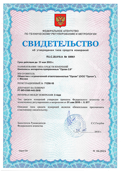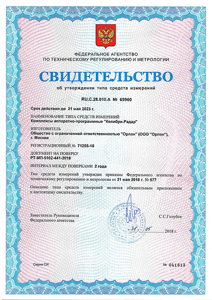 ООО «Орлан» получило свидетельства об утверждении типов средств измерений комплексов «Орлан 2.0» и «Колибри.Радар». Копии сертификатов представлены ниже.