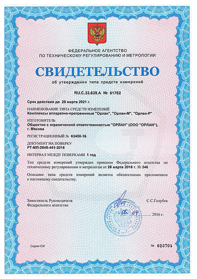 14 апреля ООО «Орлан» получило свидетельство об утверждении типа средств измерений. Копия сертификата представлена ниже.