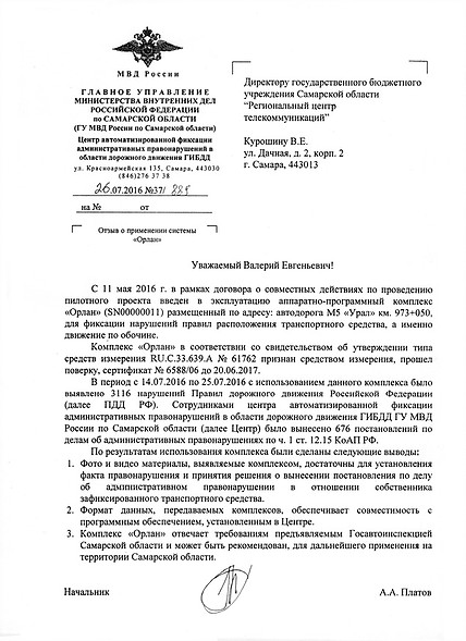 Начальник ЦАФАП в области ДД ГИБДД ГУ МВД России по Самарской области Платов А.А. составил отчет о применении системы «Орлан». По результам использования был сделан вывод о соответствии функционала комплекса всем предъявляемым требованиям.