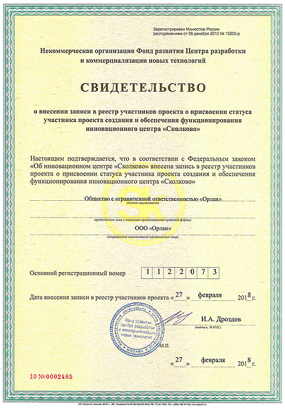 Компания «Орлан» стала участником проекта создания и функционирования инновационного центра «Сколково».